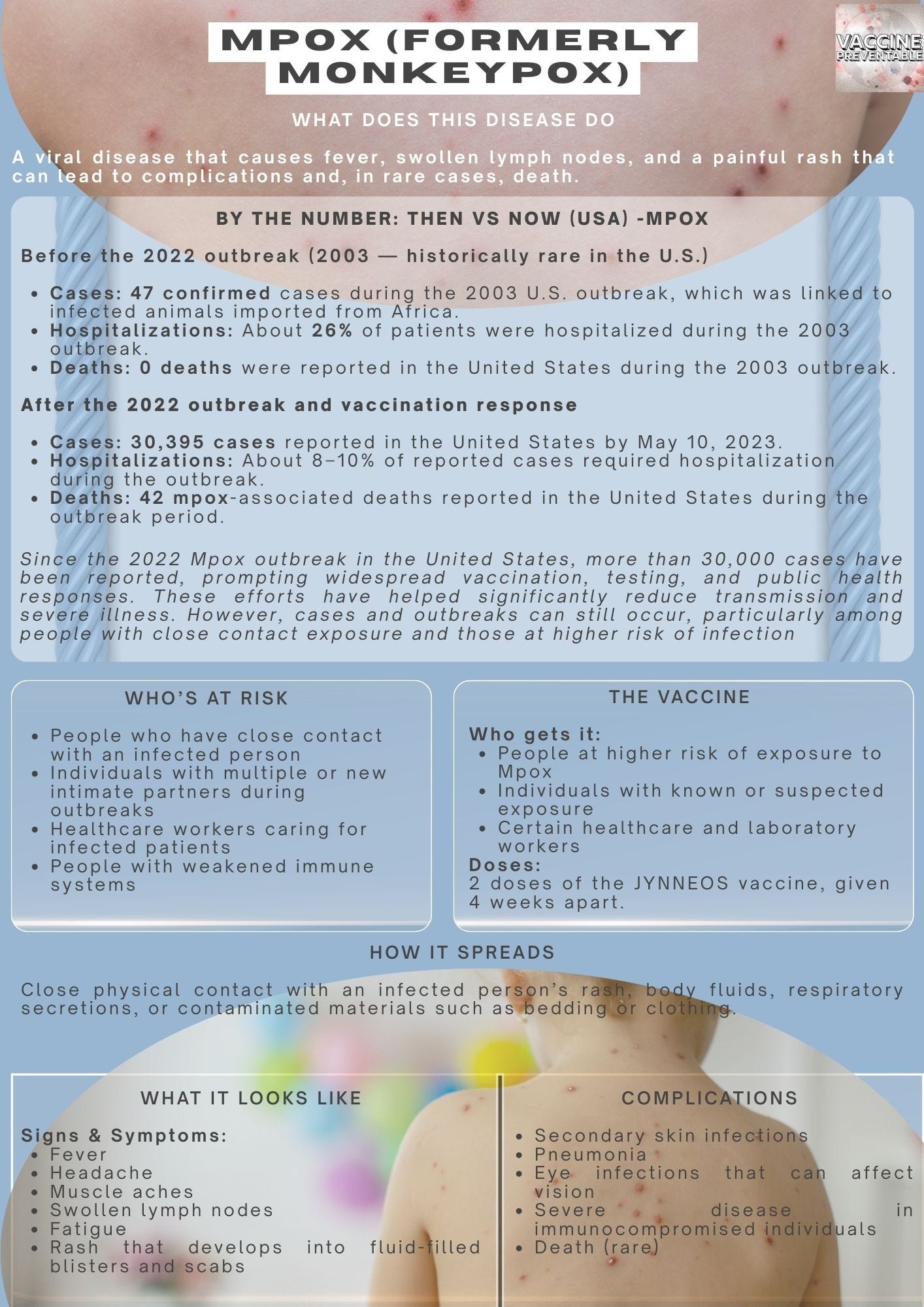 Since the 2022 Mpox outbreak in the United States, more than 30,000 cases have been reported, prompting widespread vaccination, testing, and public health responses. These efforts have helped significantly reduce transmission and severe illness. However, cases and outbreaks can still occur, particularly among people with close contact exposure and those at higher risk of infection.